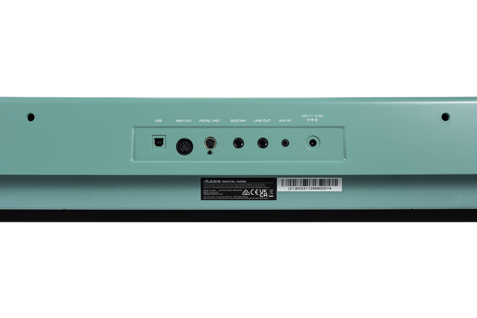 In addition to the USB port and a traditional 5-PIN MIDI output, Recital Home's rear panel features a connector for connecting the included 3-pedal unit, a 1/4” (6.35mm) sustain pedal input for connecting a standard sustain pedal (not included), a 1/4” (3.5mm) aux output for connecting to an amplifier or other external speaker system, and a 1/8” (3.5mm) auxiliary input for connecting a phone or tablet to play along with your favorite songs. Recital Home also features two headphone outputs conveniently located on the front panel of the piano that mute the internal speakers when it's time for private practice.